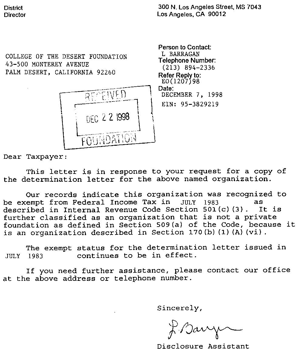 All gifts are tax deductible to the full extent allowed by law. Click here to view or download the College of the Desert Foundation tax exemption and 501(c)(3) status.