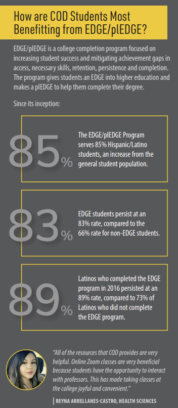 Just this past September, COD learned it was the only community college in California to be named a National Finalist in the 2021 Examples of Excelencia, presented by Excelencia in Education. The award acknowledges programs dedicated to accelerating Latino student success in higher education and the EDGE/plEDGE program was specifically recognized for those efforts.