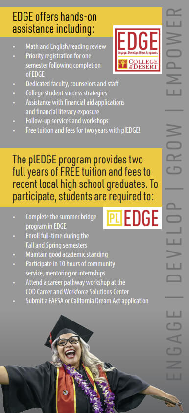 While it may sound fun and catchy, EDGE/plEDGE is a life-changing program for students who attend College of the Desert. Many of the 1,800 students in the new cohort each year would not have believed there existed a way for them to attend community college and then launch a promising career or transfer to a four-year university if someone from the program had not reached out to them personally and sparked this attainable dream.